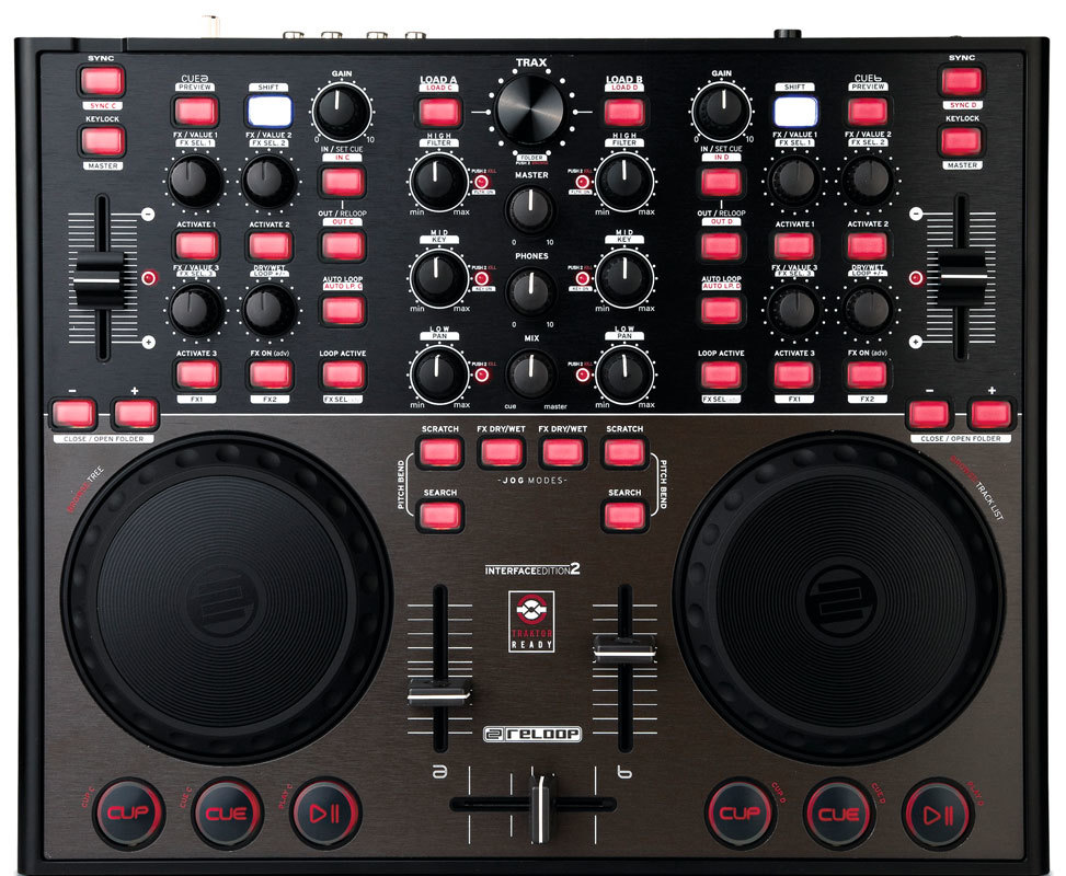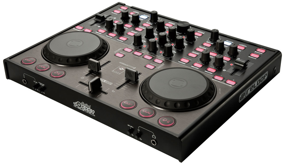 Reloop Digital Jockey 2 IE Профессиональный USB/MIDI DJ контроллер со встроенным аудио интерфейсом, прочный металический корпус, индикация 2 каналов,звуковая карта Texas Instruments, регулировка чуствительности джогов. Встроенный 4-х канальный 16бит/48кГц