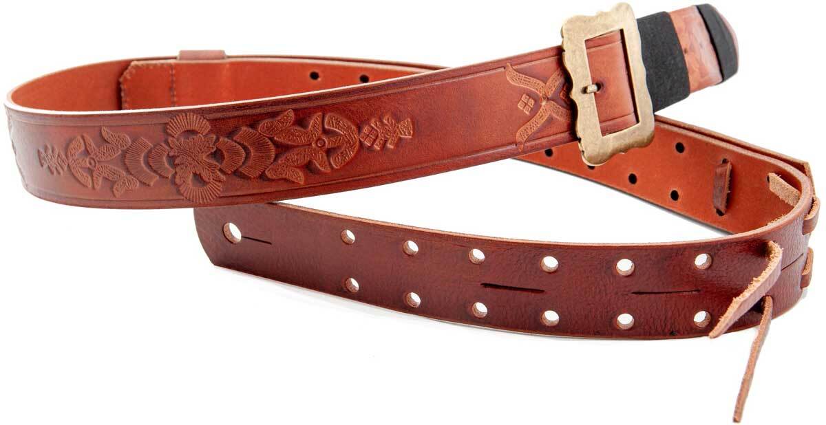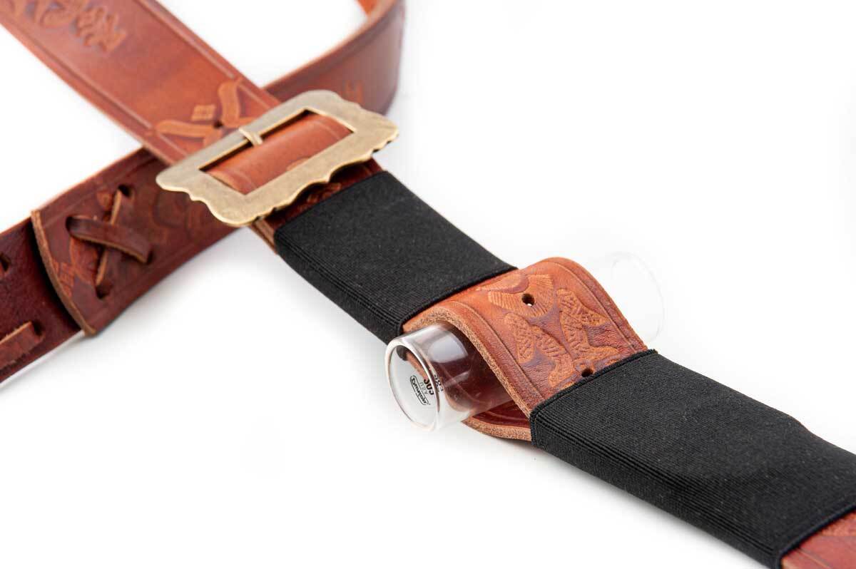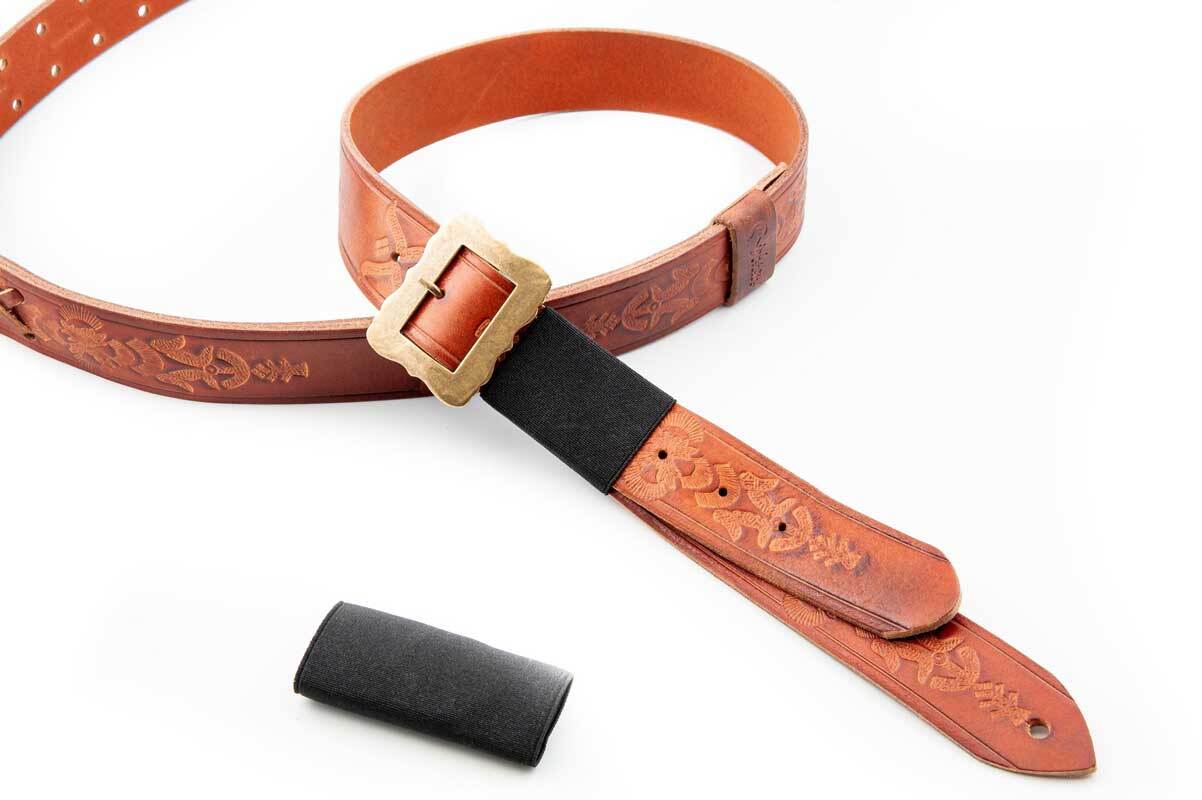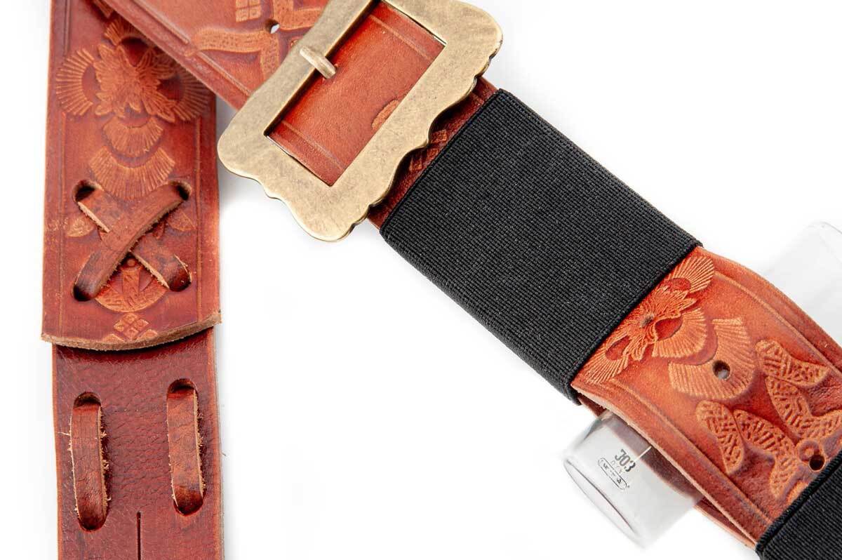 Мы также не смогли найти много письменной информации об этом ремешке, но мы смогли предположить, что этот гитарный ремень был обычным брючным ремнем, превращенным в гитарный ремень, как это делали многие гитаристы на протяжении всей истории.