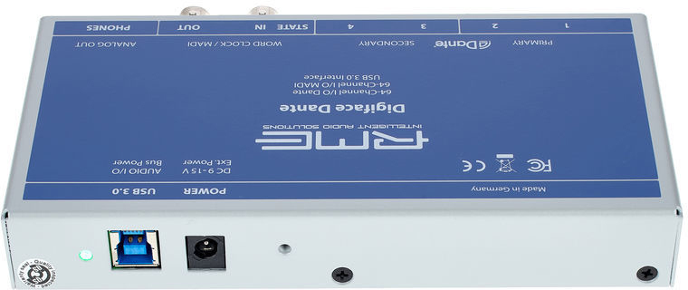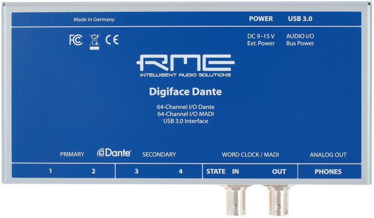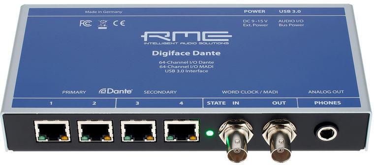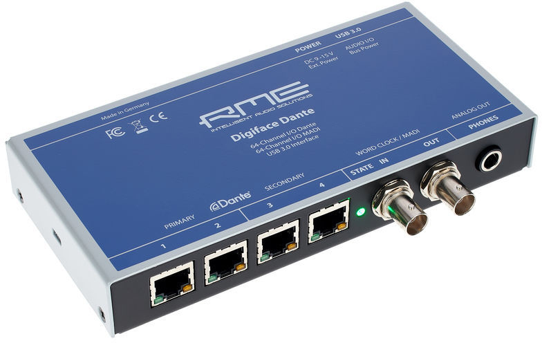 Многоканальный цифровой интерфейс RME Digiface Dante производства немецкого бренда позволяет передать 64 канала формата Dante и столько же Madi каналов с подключением к компьютерной технике посредством USB3.0. Благодаря наличию DSP поддерживаются фирменные технологии и драйвера RME, например, TotalMix FX. Помимо компьютерного подключения с вводом и выводом каналов цифровых возможна также автономная работа. Преимуществом использования протокола Dante является возможность ускоренной передачи данных без сжатия с наименьшими задержками посредством Ethernet сети.