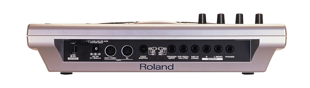 - выходы на усилитель (L (MONO), выход на наушники, Mix in для подключения CD\MP3-плеера, дополнительный вход для подключения педали экспрессии/контроллера хай-хэта, двойной вход для триггера, вход для футсвитча, MIDI-IN/OUT