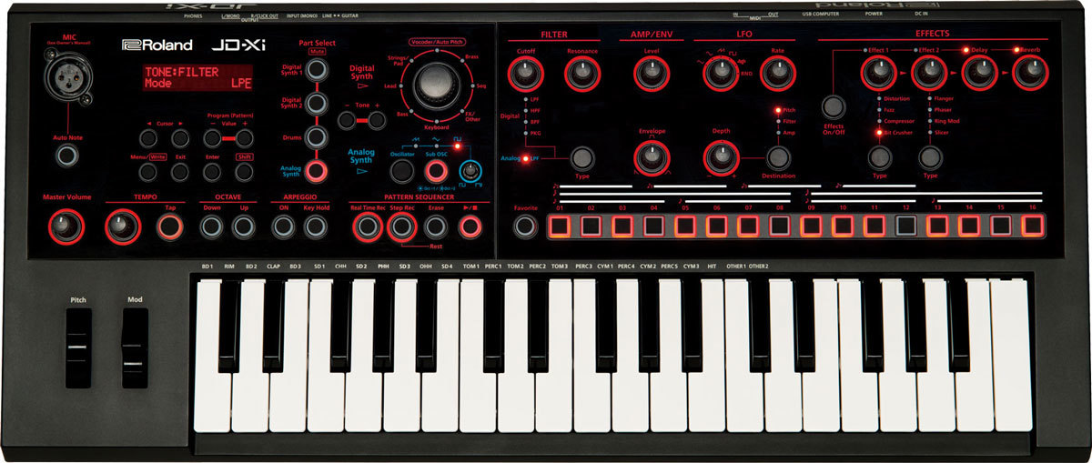 Roland JD-XI - это компактный и мощный синтезатор с 37 мини-клавишами, настоящим аналоговым генератором, SuperNATURAL звуками и широким набором возможностей для музыканта. Он обеспечит вас жирными и теплыми аналоговыми звуками басов и лид-инструментов, удобными ручками для управления синтезом, плюс всевозможными пэдами, струнными и духовыми инструментами.