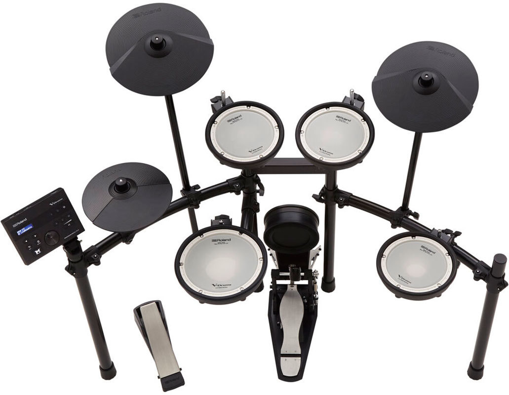 Пэды малого барабана и томов оборудованы производящими мало шума при игре двухслойными сетчатыми мембранами компании Roland, а для получения полного представления о преимуществах данной установки добавьте сюда еще большие пэды тарелок крэш и райд и специальный пэд бас-барабана с отличающейся естественными ощущениями при игре педалью.
