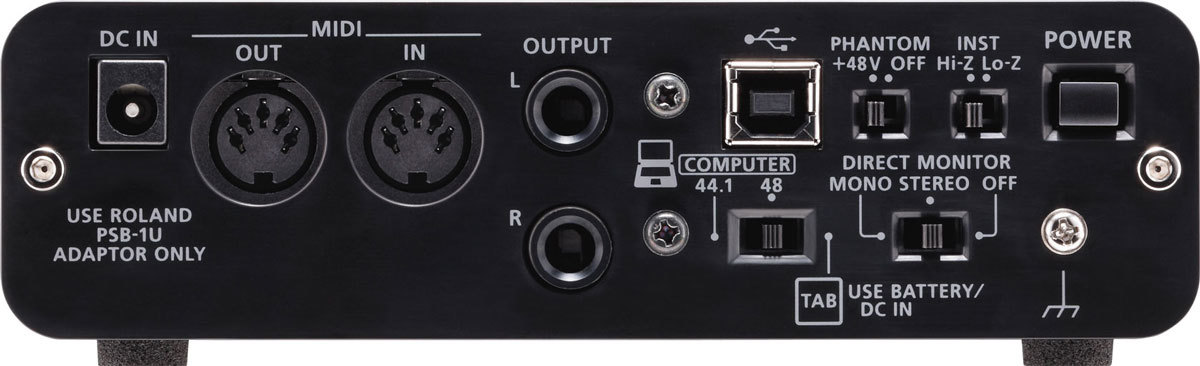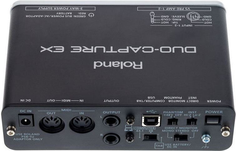 DUO-CAPTURE EX имеет два XLR/TRS комбо разъема имеют фантомное питание, а так же, вход Hi-Z, для прямого подключения гитары.