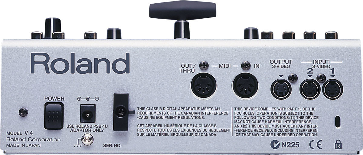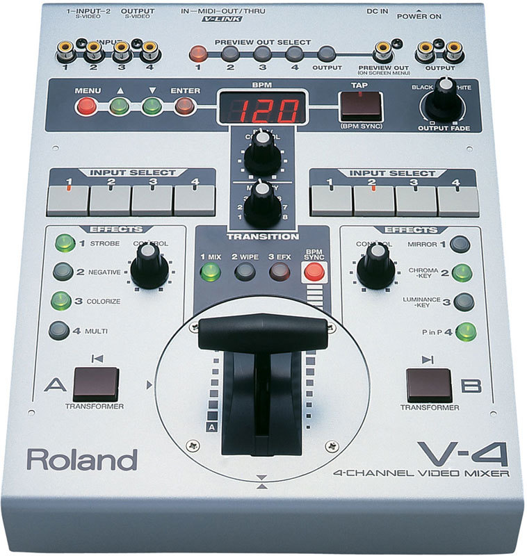 Видеомикшер V-4 предлагает переходы сцен от четырех видеоисточников, используя наплыв, шторки ( в общей сложности до 200 форм штрок) и переключение. Видеомикшер V-4 осуществляет выход одного видеоисточника на все три гнезда (композитный х 2, S-video х 1) для одновременного мониторинга и индикации без необходимости использования внешних распределительных коробок.