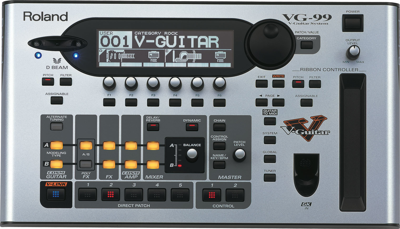 Сегодня компания Roland с гордостью объявляет о следующей вехе в области развития технологии моделирования гитар: системе VG-99. Благодаря мощнейшим возможностям трех процессоров, а также новейшим средствам выразительности, таким как Ribbon Controller (ленточный) и инфракрасный контроллер D-BEAM, этот инструмент еще шире раздвигает границы возможного в игре на гитаре.