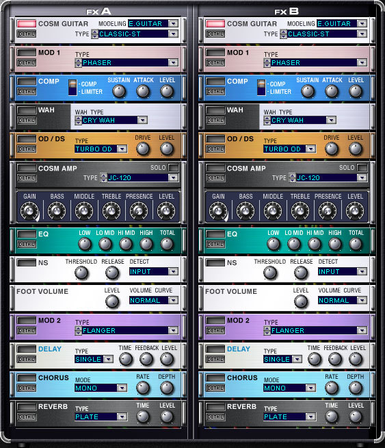 Система способна моделировать тракт прохождения сразу двух сигналов (то есть VG-99 содержит сразу два процессора). Такая двойная обработка гитарного моделирования на VG-99 позволяет музыкантам одновременно использовать сразу два различных гитарных звука. Например, одной из виртуальных гитар может быть Telecaster®, звук которой выводится через винтажный усилитель Tweed с полным комплектом эффектов, а другой – гитара с нейлоновыми струнами, имеющая только намек на реверберацию.