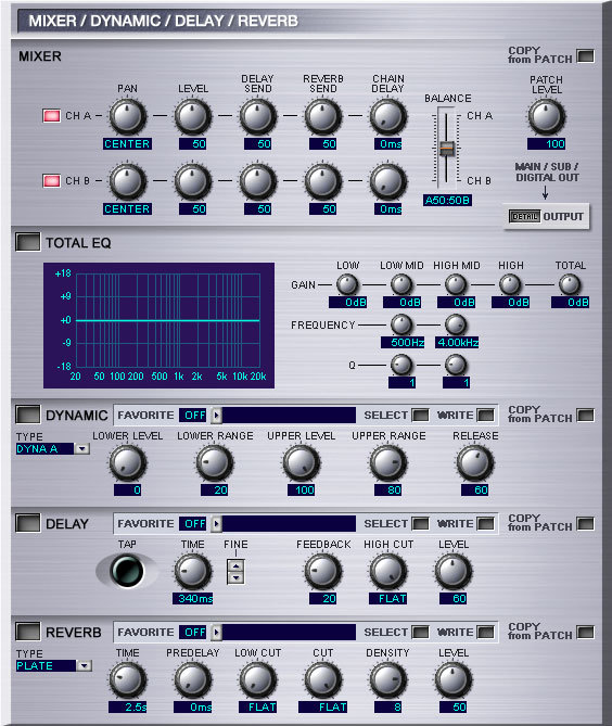 - Задняя панель: гнездо GUITAR INPUT, гнездо GUITAR OUTPUT, гнезда SUB OUT (XLR) х 2 (R,L), гнезда MAIN OUT x 2 (R, L/MONO), гнездо PHONES, гнездо DIGITAL OUTPUT, гнездо EXP PEDAL, гнездо CTL 3,4, USB соединитель, соединитель RRC2, MIDI соединители х 2 (IN, OUT), джек DC IN