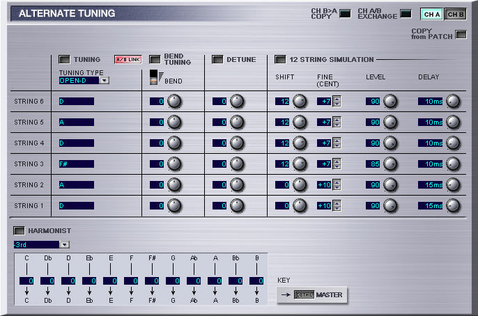 Например, виртуальную Les Paul® можно настроить на четыре или пять полутонов ниже, чтобы получить более «тяжелый» звук, в то время как гитару с нейлоновыми струнами можно настроить как 12- струнную и при этом также понизить ее звучание на четыре или пять ступеней. Поддерживаются открытый строй, так называемый drop tuning или любой другой пользовательский строй гитары.