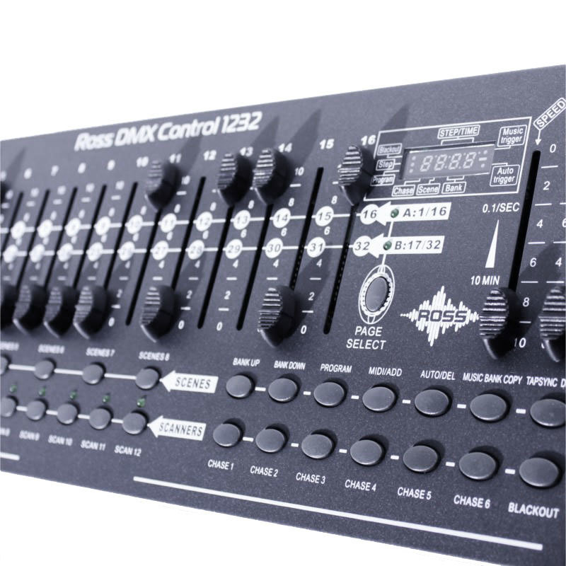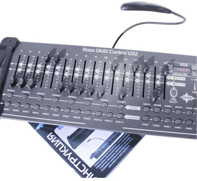 Ross DMX Control 1232 пульт управления DMX 512. 384 DMX канала Управление 12 приборами по 32 канала каждый. 30 банков по 8 программируемых сцен. 16 фейдеров для управления каналами. Midi контроль. Запись до 6 программируемых чейзов с регулировкой времени