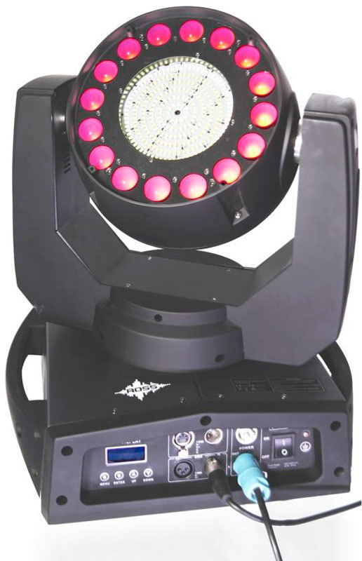 Ross Stroblight Wash 16x3w Вращающаяся голова светодиодная со встроенным стробоскопом, wash эффект 16 х 3 Вт (3 в 1) светодиодов - стробоскоп: 6 колец, 252х0,5 Вт белых светодиодов 66/18 DMX-каналов, 4 режима работы: DMX-512, авто, звуковая активация и Ma