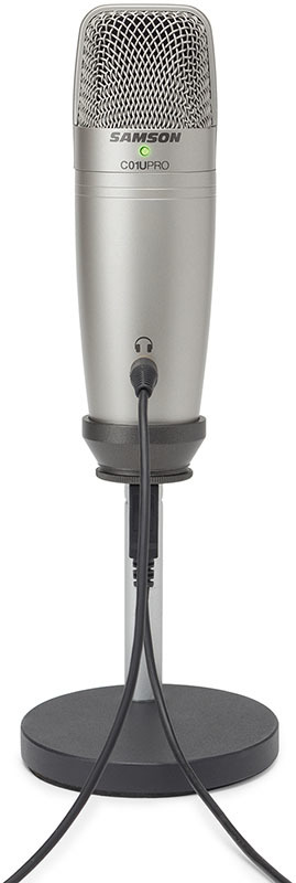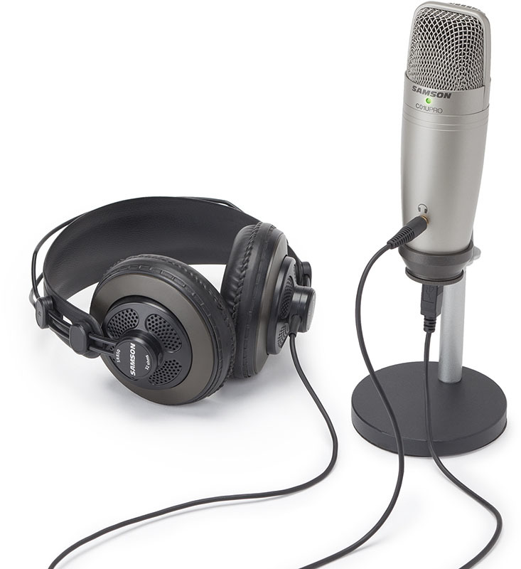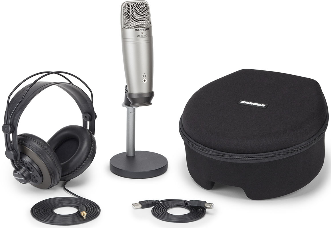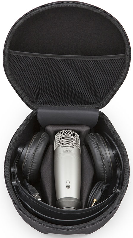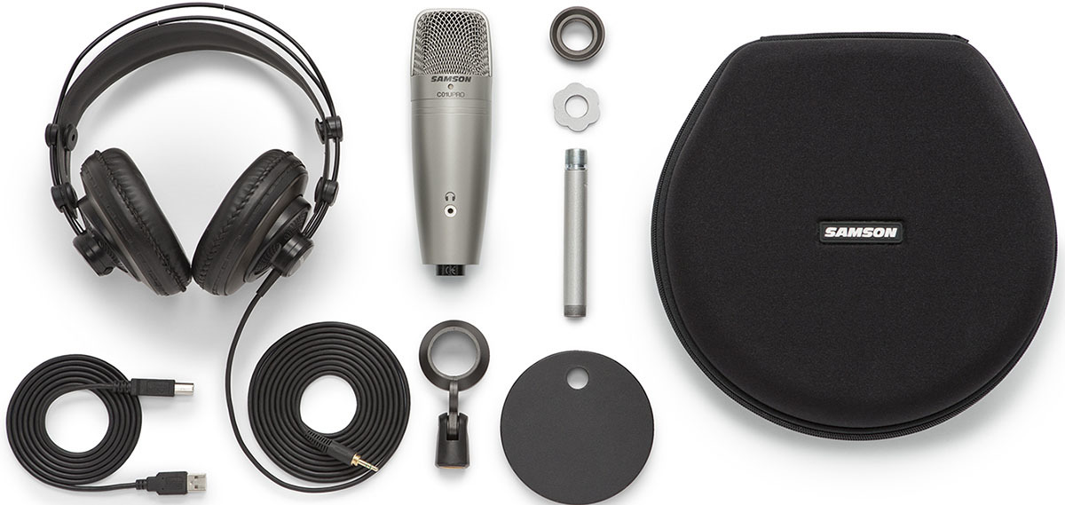 В набор входят USB микрофон Samson C01U Pro, полуоткрытые наушники Samson SR850, настольная микрофонная стойка Samson MD2, USB кабель и удобный кейс для хранения и транспортировки.