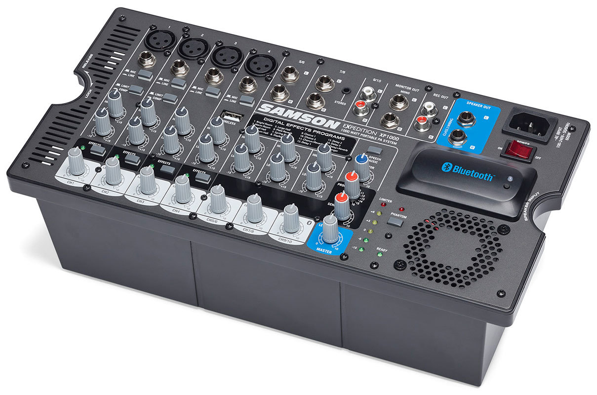 Акустическая система Expedition XP1000 имеет модуль беспроводной связи Bluetooth, а это значит, что теперь вы можете без труда воспроизводить музыку со смартфонов, планшетов и ноутбуков. Встроенный в съёмный 10-канальный микшер усилитель мощности D класса 1000 (2*500) Вт оснащен четырьмя линейными/микрофонными входными каналами (с разъёмами XLR и 1/4" на каждом канале) для подключения микрофонов и активных инструментов, а также тремя стереовходами для подключения внешних устройств типа плееров, синтезаторов и т. п.