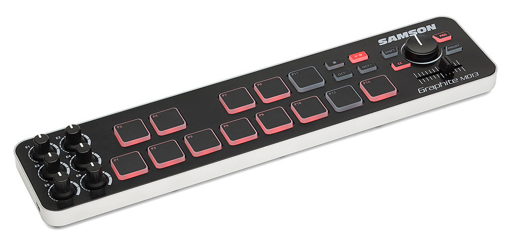 USB MIDI контроллер Samson Graphite MD13 студия на дому теперь доступна всем, а музыку можно создавать прямо на ходу. Graphite MD13 обладает 13 хроматически упорядоченными, чувствительными к силе нажатия пэдами с задней подсветкой. Помимо этого, MD13 обладает шестью кнопками параметров, кроссфейдером в стиле диджеев и стрелками управления. А с помощью iPad/ USB питания, достаточно просто подключить MD13 и вы уже можете выжать максимум из вашего софта, не важно, где вас посетила муза.