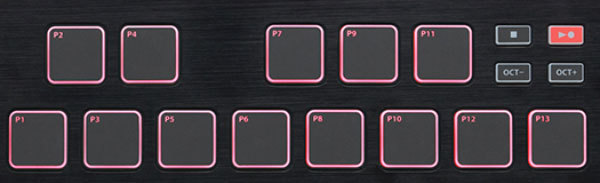 - 13 хроматически упорядоченных пэда (два банка в каждом) чувствительных к силе нажатия с эффектом послекасания и задней подсветкой