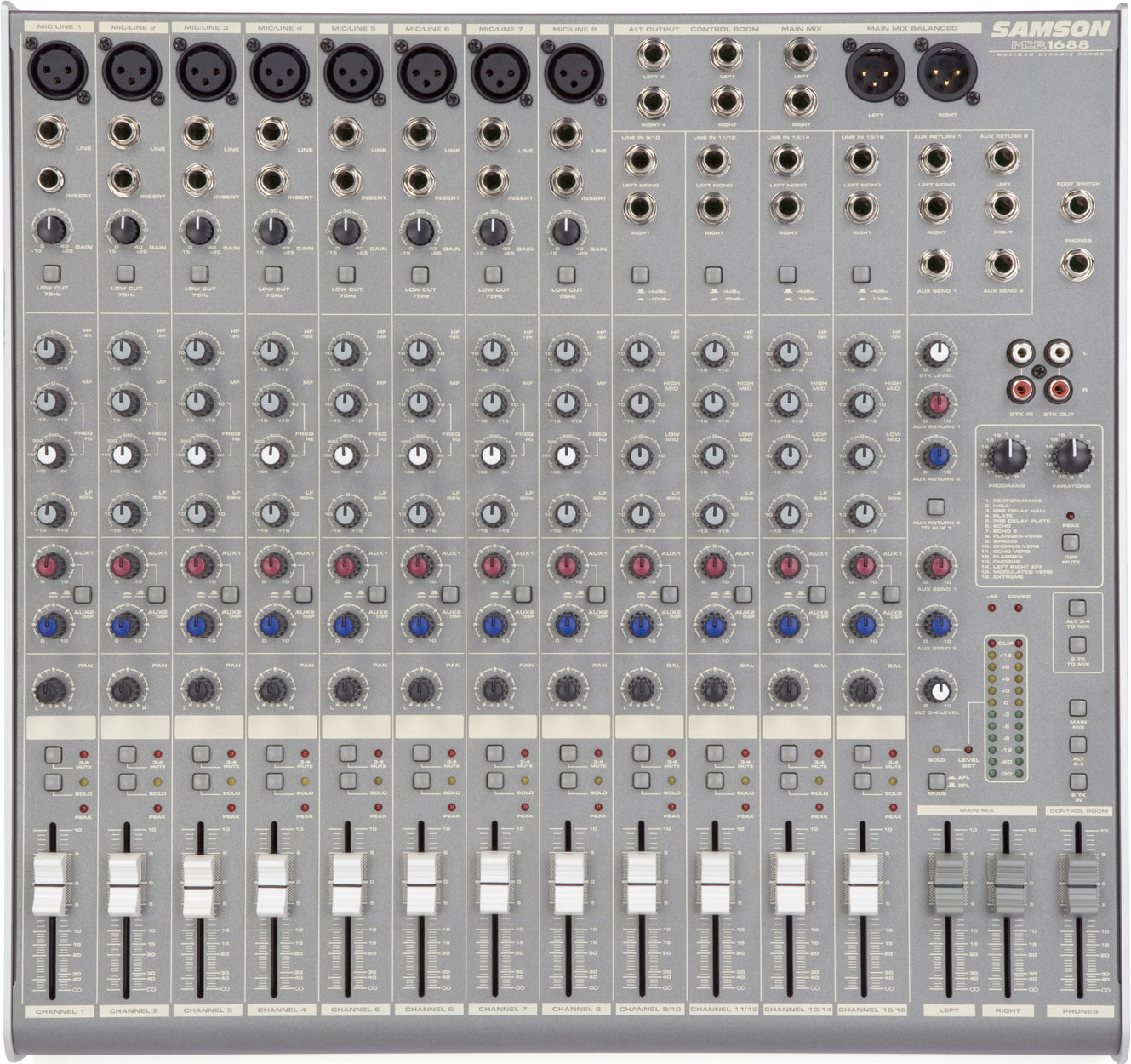 Samson MDR 1688 микшерный пульт 8 моно входов с инсертами+4 стерео входа, 2AUX посыла, 60 мм фейдеры, процессор DSP с 256 пресетов, 405x425x65мм,вес 5,85 кг, SAMSON
