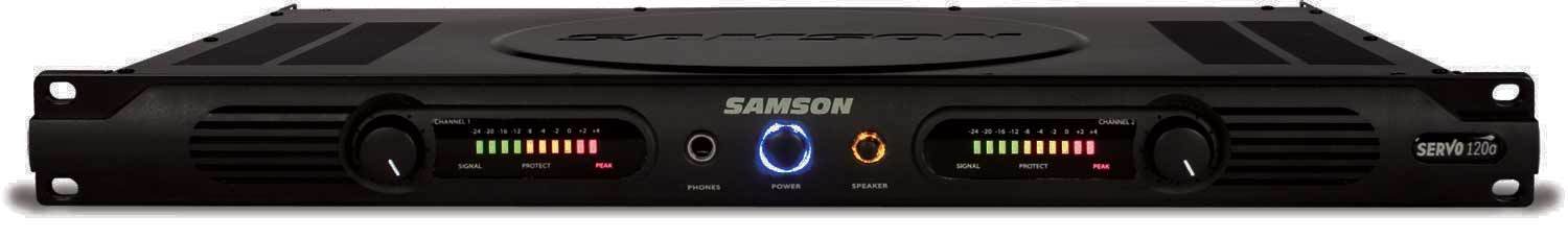 Samson Servo 120A студийный усилитель мощности, 2х60W/4 Ома, 120 ватт на нагрузке 8 Ом (мостовой режим моно), бесшумное охлаждение конвенкторного типа, высота 1U. SAMSON