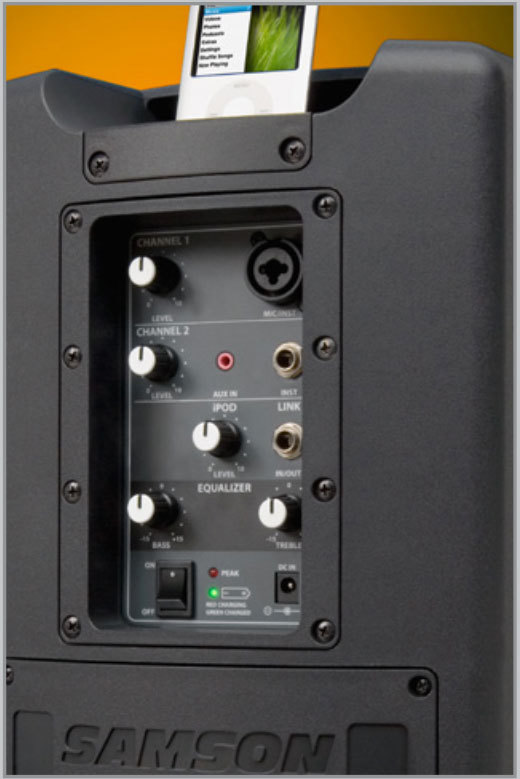 Встроенная док-станция iPod с контролем уровня, дает вам превосходную возможность разбавить ваше выступление песней или какой-либо другой аудиозаписью. К тому же, с регулировкой баса и высоких частот вы сможете отстроить ваш звук до необходимого уровня.