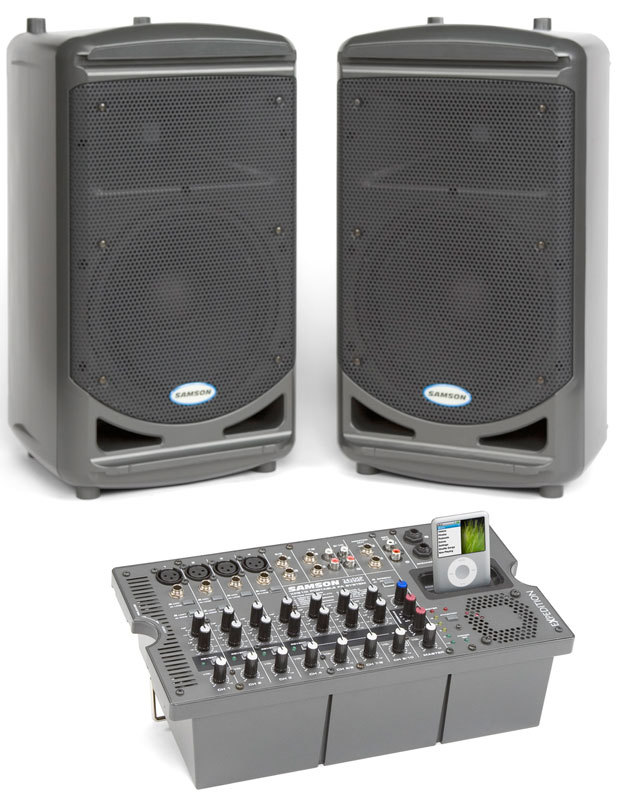- Компактная акустическая система с двумя двухполосными колонками, микшером и 500-ваттным усилителем;