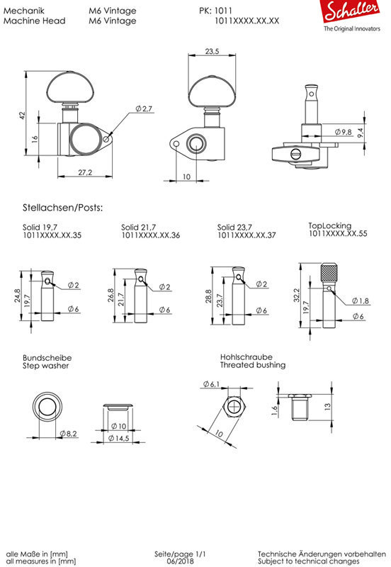 Серия M6 Vintage. Корпус этих колков расширяет ряд колков Schaller. Это прекрасная комбинация с внешностью Vintage и качеством Schaller. Используются многими популярными гитарными производителями. Высочайшее качество и точность настройки! Износостойкость! "Самоблокирующаяся" конструкция позволяет осуществлять "деликатную" и устойчивую настройку. Все колки покрываются специальной защитной смазкой, разработанной компанией Шаллер.