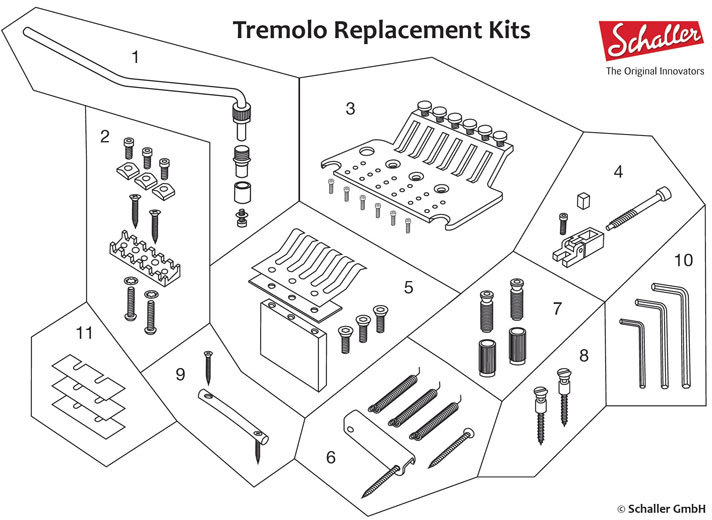 Тремоло система поставляется в комплекте с верхним порожком R2, фиксаторами струн, пружинами, винтами регулировки высоты, ключом и аксессуарами.