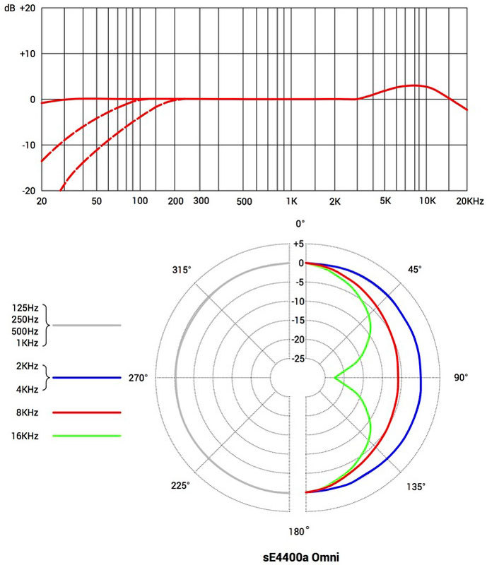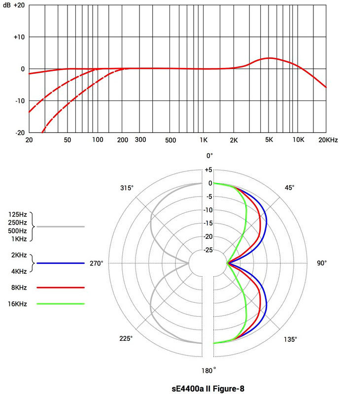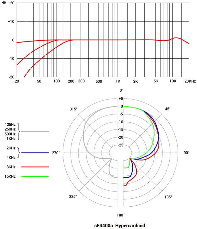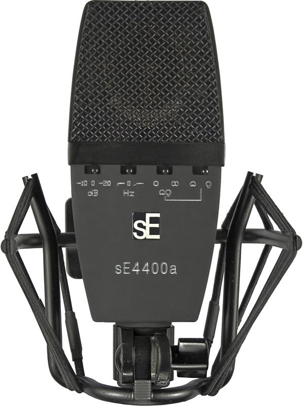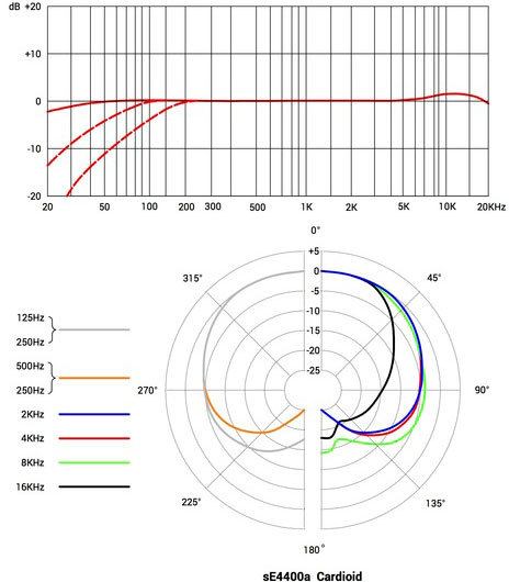 sE4400a имеет 4 диаграммы направленности: кардиоиду, гиперкардиоиду, восьмерку и всенаправленную. Два бас сокращения 60Hz и 120Hz, две подушки-переключателя на 10dB и 20dB. корпус очень маленький, но способен разместить капсулу с двойной диафрагмой 1" и всю высшего класса электронику и переключатели. Этот плоский с закругленными краями корпус разработан принимая во внимание использование микрофона на барабанах или гитарных комбиках, а также безупречен для вокала.