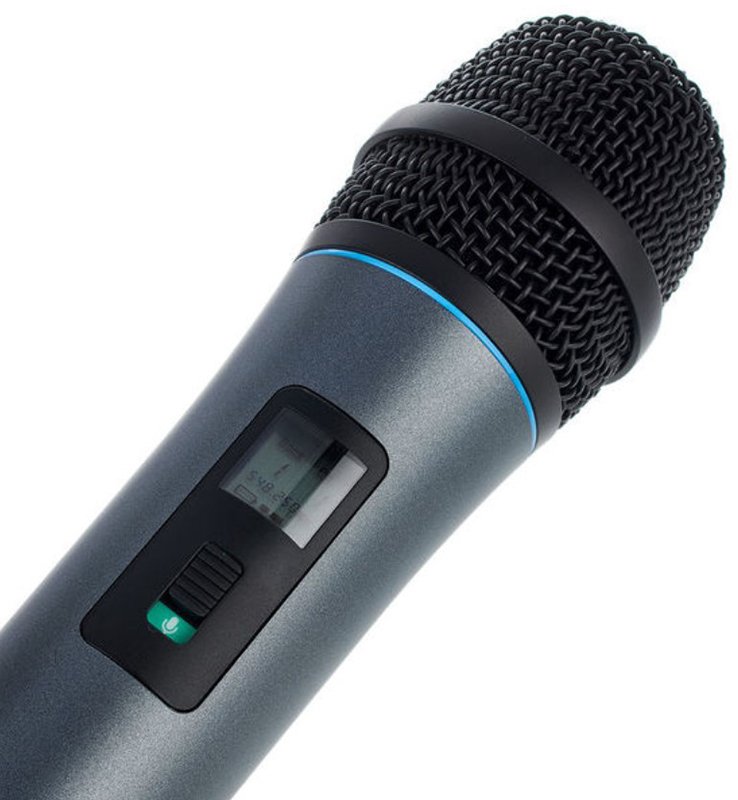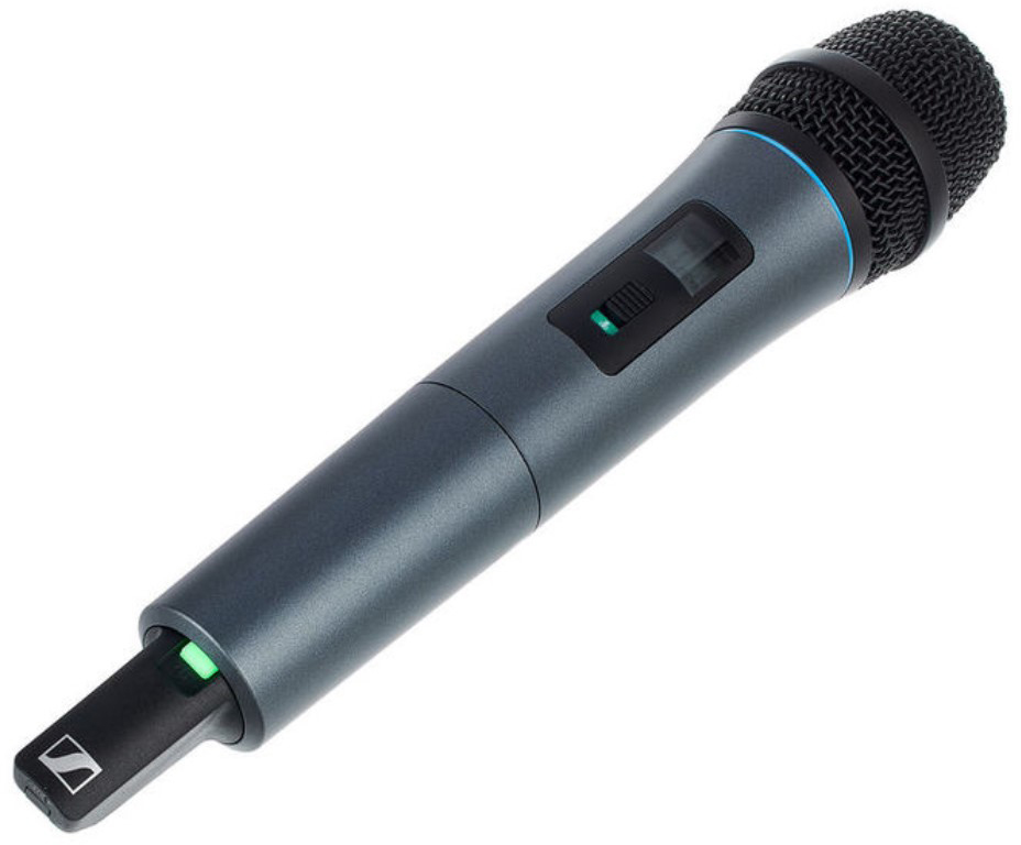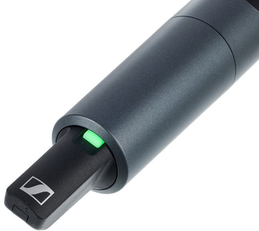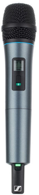 Ручной передатчик SKM 825-XSW также представлен в корпусе из ABS-пластика. Он оснащен динамическим типом капсюля, который обладает низкой входной чувствительностью и наиболее уместен при использовании в концертных условиях, где высок уровень окружающего шума. Разборчивому и чистому тембру также способствует кардиоидная диаграмма направленности, которая остается чувствительной лишь к сигналам спереди от капсюля, подавляя все звуки по сторонам и сзади от него. Микрофон способен озвучить диапазон частот от 80 Гц до 14 кГц. Выходная мощность устройства равняется 10 мВт, а на корпусе располагаются переключатель чувствительности с положениями 0, 10, 20 и 30 дБ, кнопка Mute и ЖК-дисплей, отображающий номер выбранного канала и остаток заряда. Питание осуществляется от двух батареек типа АА, время работы может достигать 10 часов.