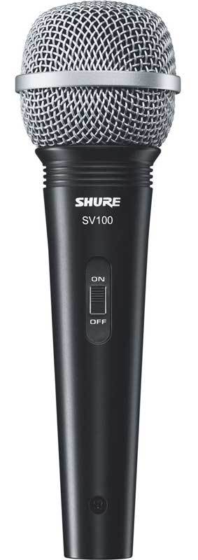 SHURE SV100-A микрофон динамический вокально-речевой с выключателем и кабелем (XLR-6.3 мм JACK), черный, серебристая сетка.