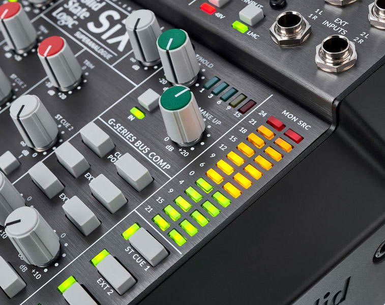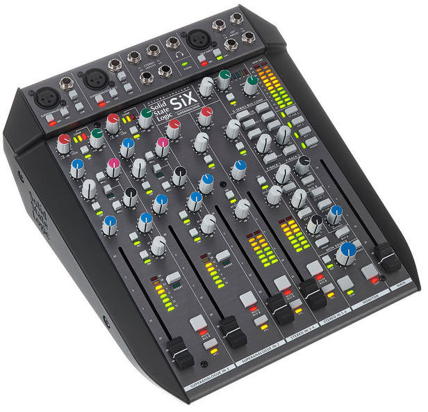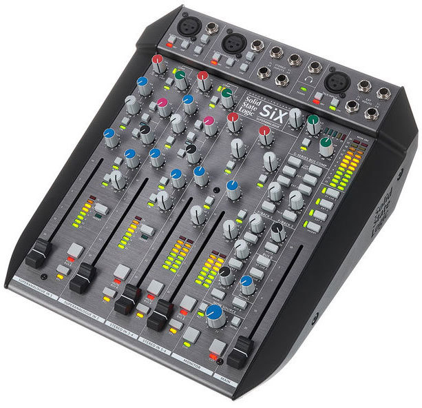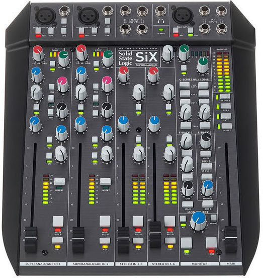 SSL SiX – аналоговая настольная консоль профессионального уровня, сочетающая в себе микшер и инструменты SSL под обработку звука. Предназначена для использования в студии, в постпродакшне, на сцене и для подкастинга. Имеется два канала записи с микрофонными предусилителями Super Analogue. Они обеспечивают усиление 66 дБ, низкий уровень шума и искажений при широком динамическом диапазоне.
