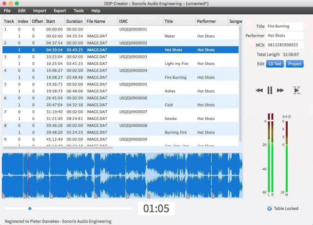 С помощью DDP Creator вы можете собрать RedBook-совместимый CD, просто перетащив подготовленные 16-битные файлы .wav или .aif в рабочую область и установив порядок треков. После этого вы можете настроить промежутки между треками и прослушать их, воспроизводя переход с одного трека на другой. Затем отредактировать PQ-точки, ISRC, MCN и CD-Text данные. Наконец, экспортировать в DDP, Cue Sheet или на CD и, если необходимо, распечатать PQ-лист.