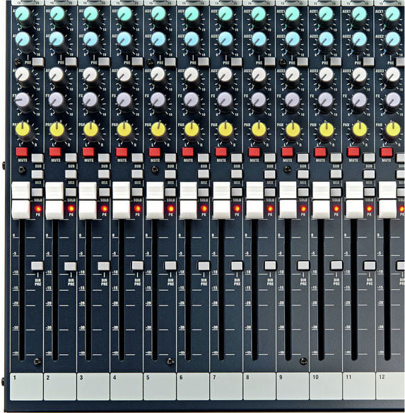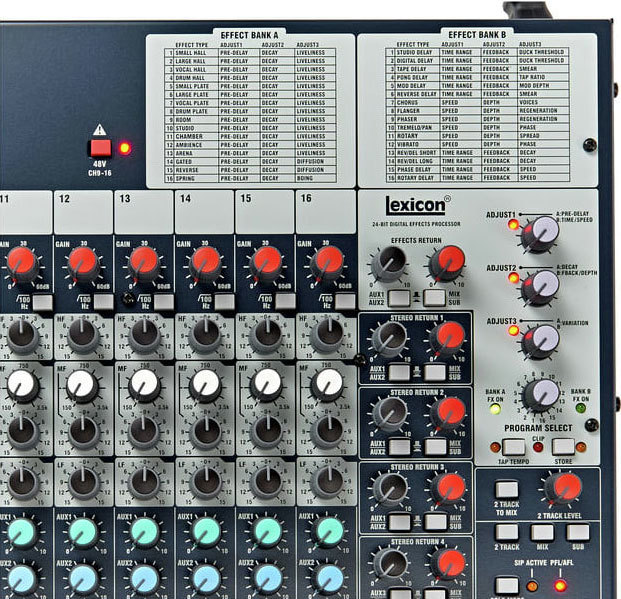 Процессор эффектов имеет три регулировки параметров и световые индикаторы. На пульте есть три доступых линии Aux Sends, на каждом канале. Их можно использовать для установки миксов мониторной линии, глубины подключенного эффекта. 2 SUB группы существенно облегчают работу с такими сложными музыкальными инструментами как барабаны, духовой бэнд, группа бэк вокала.