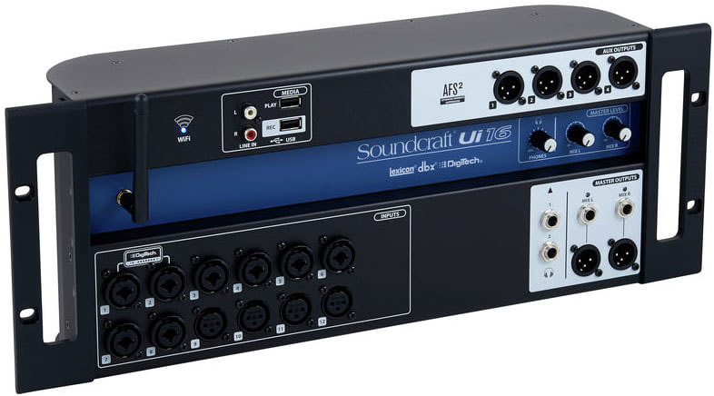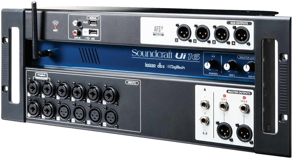 Ui16 также оборудован 8 XLR combo mic/line входами, 4 XLR mic входами, 2 каналами входов Hi- Z/instrument, а также линейным входом stereo RCA. Среди остальных функций и характеристик: 2-канальный USB медиа-плеер, 4 балансных XLR Aux выхода, два выхода на наушники 1/4 дюйма с регулировкой уровня, балансный stereo XLR и 1/4 main выходы. Кроме того, у Ui16 есть выход HDMI.