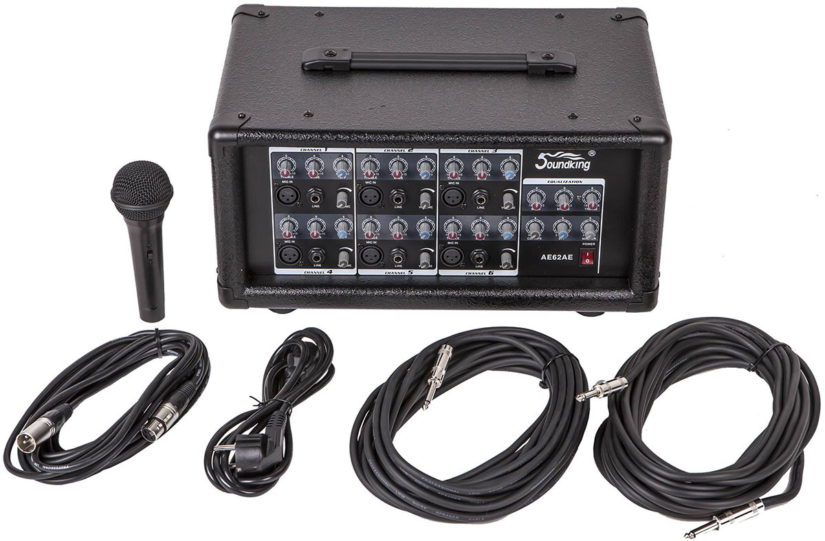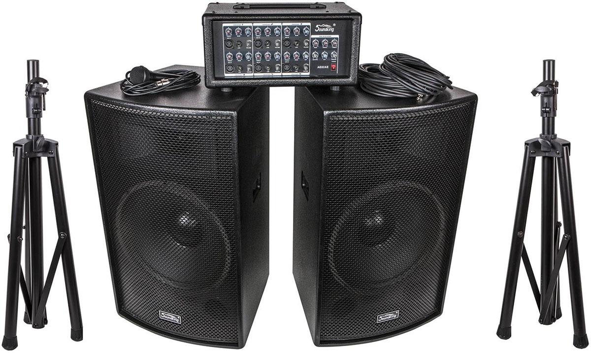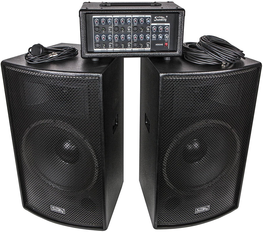 Мобильный звуковой комплект общей мощностью 500 Вт состоящий из микшерного пульта со встроенным усилителем и акустических систем с 15" динамикам и пьезо твитером. В комплект поставки так же входят динамический микрофон с кабелем 5 метров и два акустических кабеля Jack-Jack длиной по 10 метров каждый.