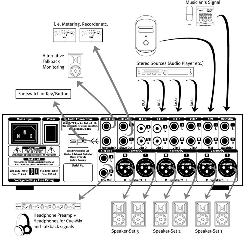 SPL MTC - мониторный контроллер с переговорной системой. Имеет пару симметричных входов для мониторинга записываемого сигнала, пару симметричных входов для мониторинга микса, две пары симметричных входов и две пары несимметричных входов для двухдорожечных устройств, три пары симметричных линейных выходов для акустических систем, кнопки выбора пары входов и пары выходов, пару дополнительных симметричных выходов (на них поступает сумма всех активных входов, кроме входа для исполнителя), выход для наушников на передней панели с кнопкой включения.