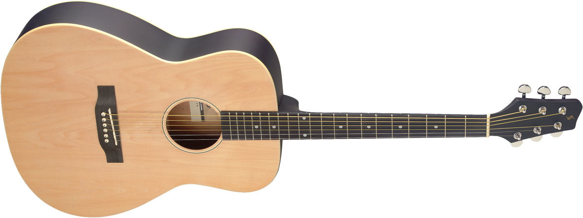 STAGG SA35 A-N – шестиструнная акустическая гитара в корпусе типа Auditorium натурального цвета. Ее верхняя дека выполнена из липы, а вот нижняя дека и обечайки сделаны из экзотического дерева катальпа. Из него же выполнен и гриф, накладка на который сделана из синтетической древесины. Из такой же древесины создан и бридж.