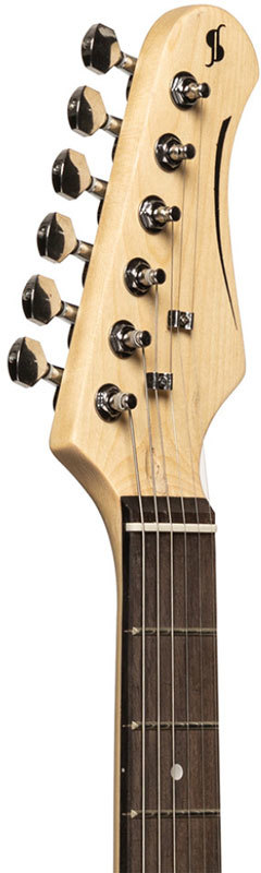Электрогитара STAGG SES-30 обладает тремя звукоснимателями-синглами, одной ручкой регулировки громкости и двумя – тембра. Есть 5-ти позиционный переключатель звукоснимателей. Бридж вибрато выполнен в S-стиле, колки – никелевые, литые. Верхний порожек – костяной. На гитару установлены струны Корейского производства и пикгард состаренного белого цвета. Мензура – 648 мм.