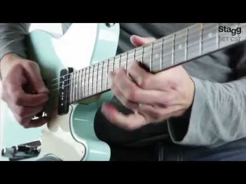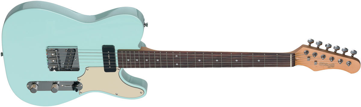 STAGG SET-CST SNB - шестиструнная винтажная электрогитара серии «Т» в корпусе типа «телекастер» в красивой глянцевой голубой отделке sonic blue с одним катавеем для удобного доступа к ладам. Ее корпус целиком выполнен из ольхи. Гриф на болтовом креплении обладает матовой отделкой и сделан из твёрдого клёна. Маркеры ладов выполнены в виде белых точек.