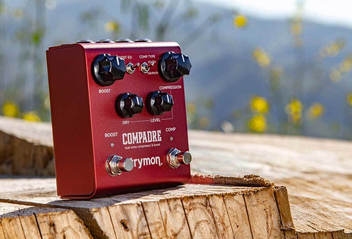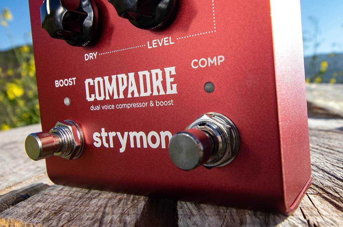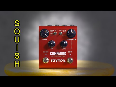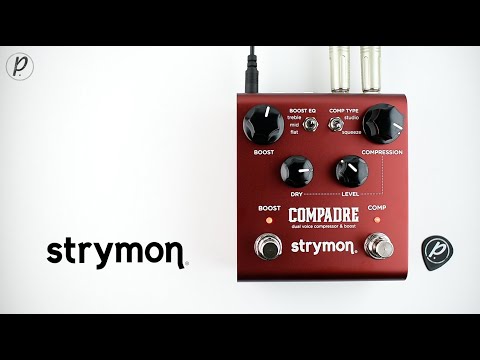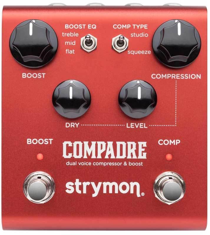 Strymon Compadre - программируемый аналоговый VCA компрессор и бустер. Два режима компрессии - прозрачный студийный, что свойственно компрессии на базе VCA, и более жесткий, как Dyna Comp. Два режима бустера - чистый и с овердрайвом. Поддержка МИДИ. 3 опции эквалайзера. Смешение чистого и обработанного сигнала.
