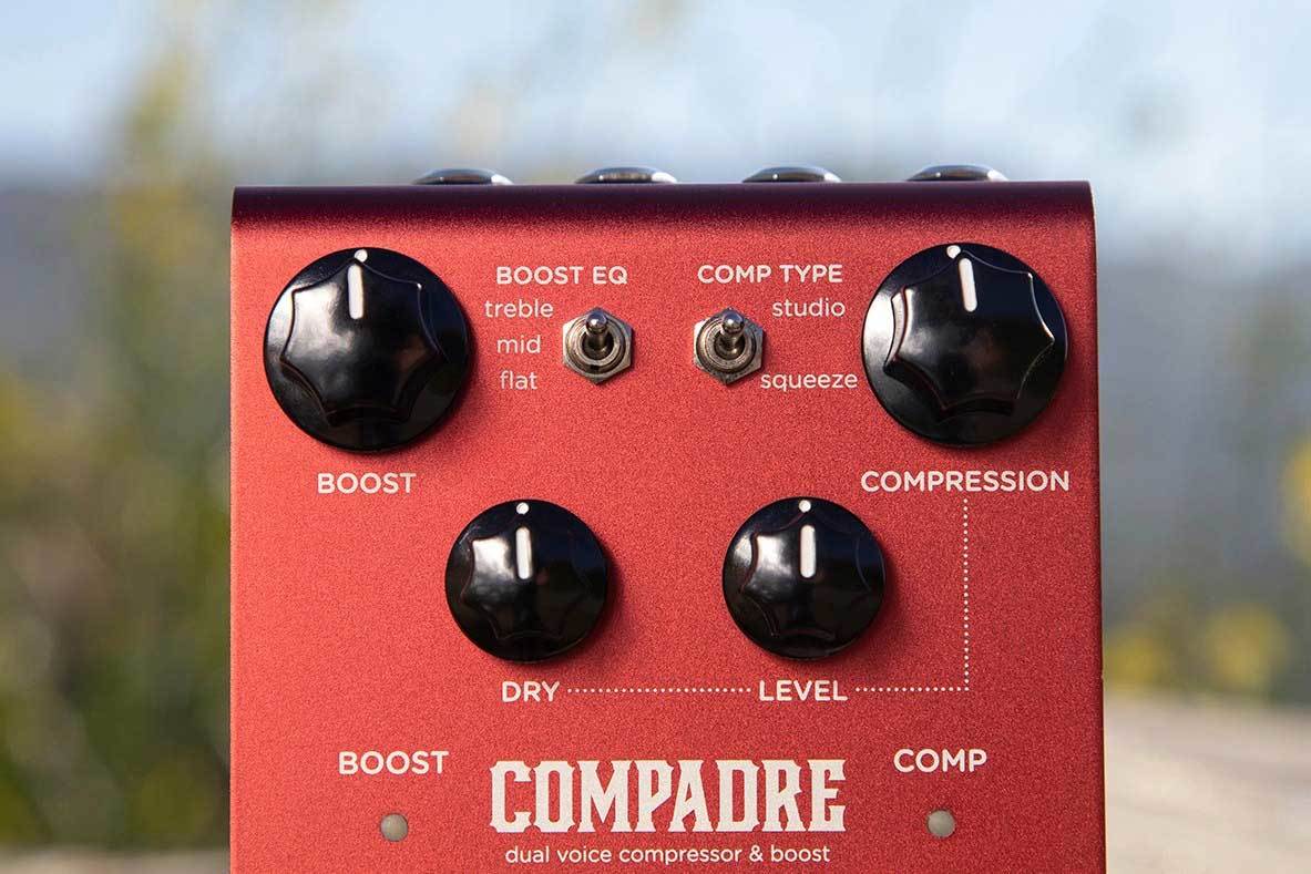 Compadre предлагает две схемы компрессии на выбор, и каждая со своим характером. Режим Studio дает мягкую, невероятно прозрачную динамическую обработку, которыми славятся винтажные студийные VCA приборы. Для более жесткого и окрашенного эффекта, в духе классических педалей был сделан режим Squeeze, который дает интенсивную компрессию с максимальным сустейном.