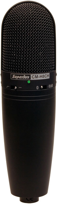 Superlux CMH8CH – конденсаторный микрофон с большой диафрагмой, схожий по характеристикам с CMH8C/B/A, который отличается от них более детальным частотным воспроизведением. Он обладает той же диаграммой направленности, что и его «собратья по серии», за исключением двух отличий: стильный черный корпус, расширенная звукопередача низких частот и дополнительное усиление высоких. Для удобства пользователя встроенный светодиодный индикатор сообщит о наличии фантомного питания.