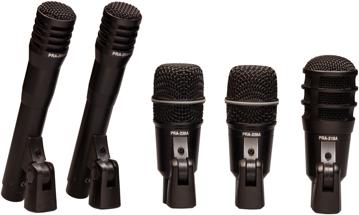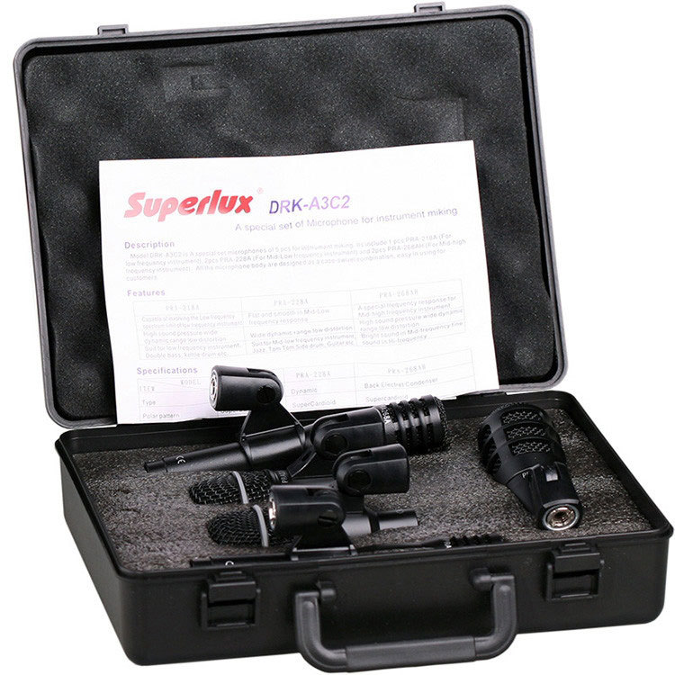 Superlux DRKA3C2 - набор из пяти барабанных микрофонов. Они предназначены для использования во время живых выступлений, а также для репетиций. PRA-218A предназначен для большого барабана, два PRA-228A - для томов и еще два конденсаторных микрофона PRA-268A - для оверхедов. Кроме того, их можно использовать для снятия звука со струнных и духовых инструментов. Все микрофоны оснащены несъемными держателями для установки на стойки.