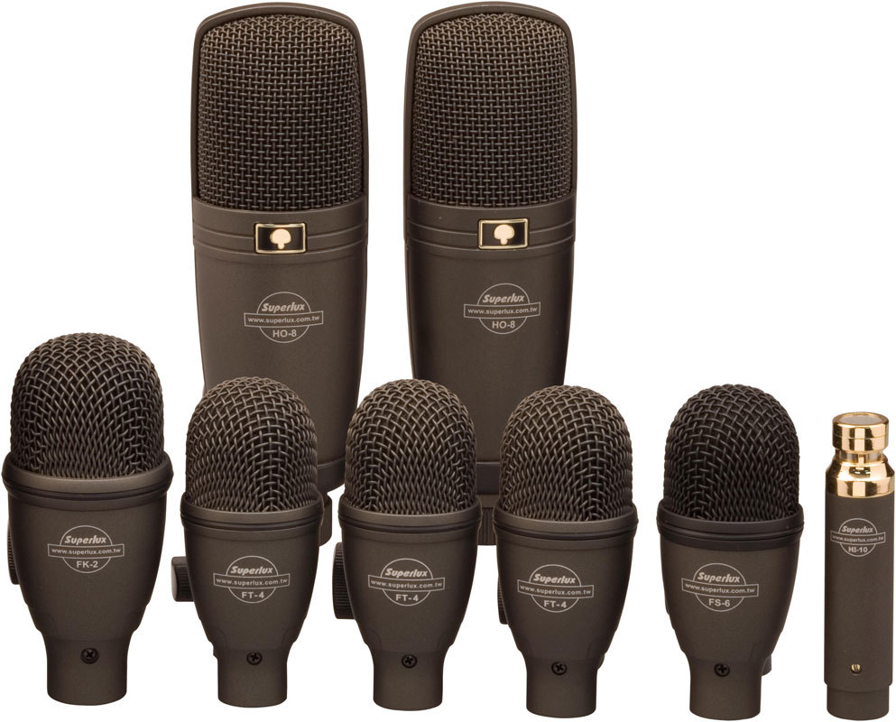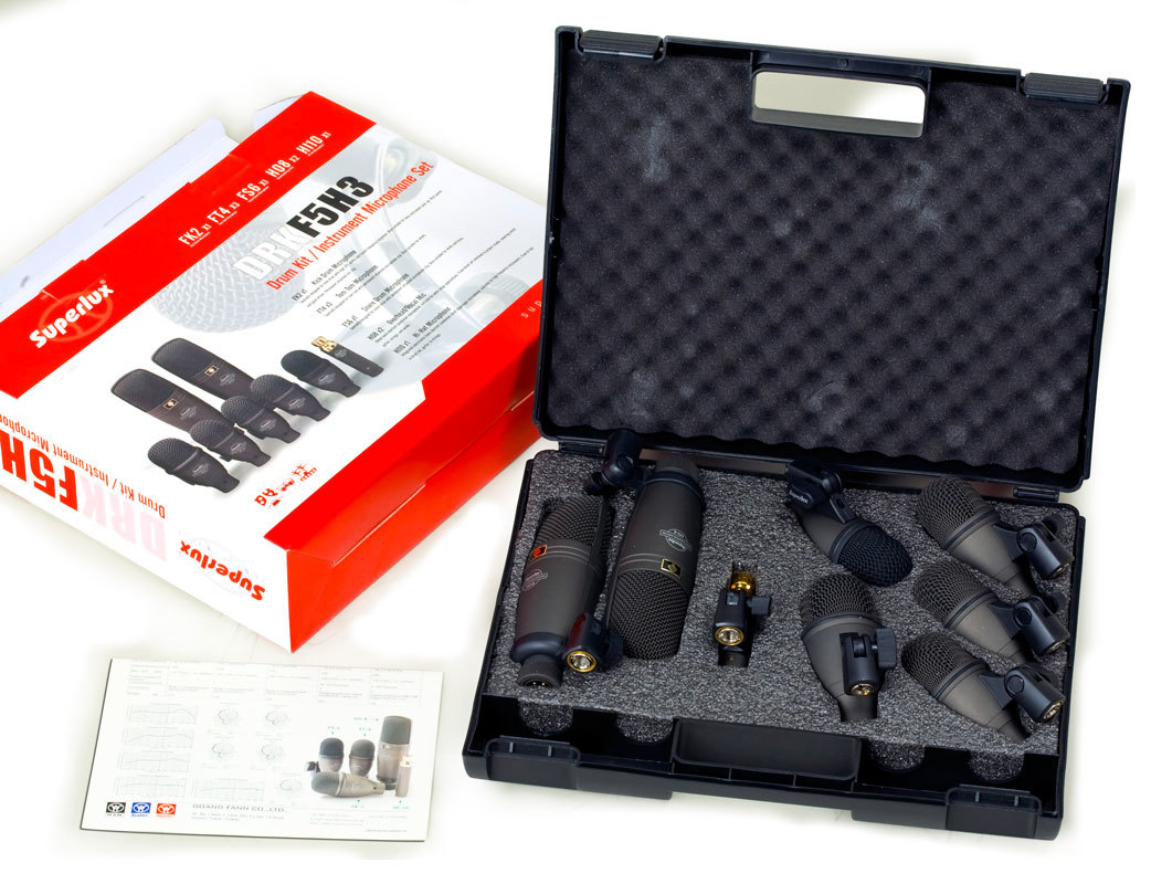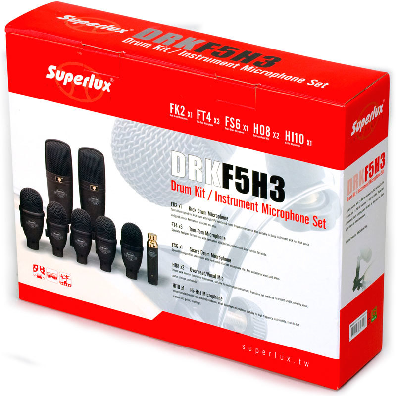 Superlux DRKF5H3 - набор из восьми барабанных микрофонов. Два микрофона HO-8 для оверхедов, один FK-2 для большого барабана, три FT-4 для томов, один FS-6 для малого барабана и один HI-10 для хай-хэтов. Данный набор микрофонов также можно использовать для подзвучки других музыкальных инструментов. Удобный пластиковый чехол в комплекте.