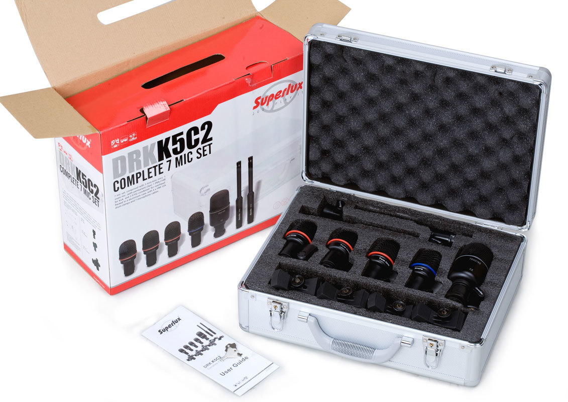 Superlux DRKK5C2 - это набор из семи профессиональных микрофонов для подзвучки ударной установки. Эти высококачественные микрофоны можно также использовать с множеством других инструментов, например, со струнными и духовыми.