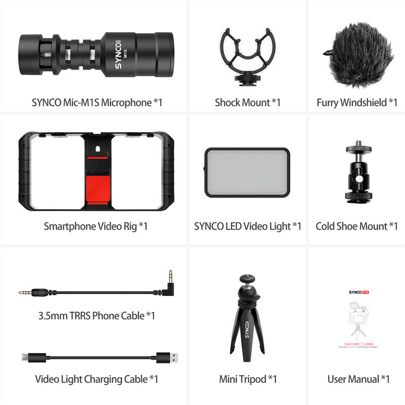 Synco Vlogger Kit 1 набор для влогеров, микрофон, кабель для телефона/камеры, ветрозащита, шокмаунт, подсветка, стойка, рамка для смартфона