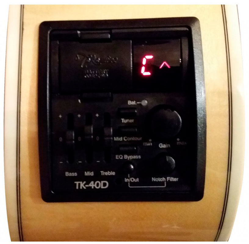 Встроенный предусилитель собственной разработки Takamine TK-40D обеспечивает высокое качество звучания при игре с усилением и максимальную гибкость настроек. Он оснащен тюнером, трехполосным эквалайзером с возможностью обхода, регулятором гейна, переключателем контура средних частот, нотч-фильтром.