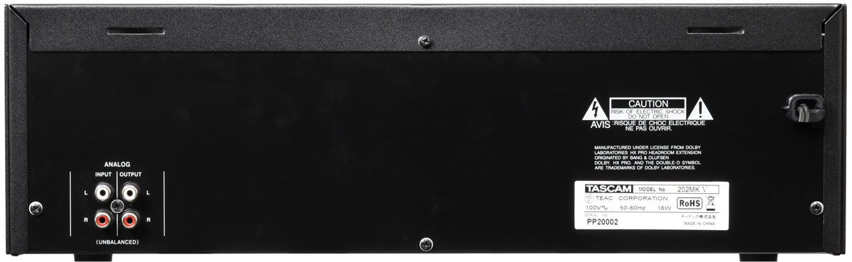 Кассетный магнитофон с 2 полнофункциональными деками. Ускоренное копирование, параллельная запись, реверс, режимы шумоподавления Dolby B и HX Pro. Вход: 2 небалансных аналоговых RCA, дополнительный регулируемый микрофонный вход TRS. Выход: 2 небалансных а