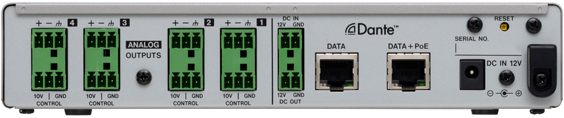 Tascam ML-4D/OUT-E Dante-Analogue конвертор с DSP Mixer, 4 аналоговых линейных выхода с разъёмом EUROBLOCK, питание PoE (Power over Ethernet) или опционально адаптер PS-P1220E в комплект не входит.