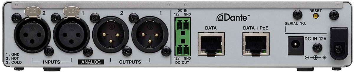 Tascam MM-2D-X Dante-Analogue конвертор с DSP Mixer, 2 MIC(+48V)/LIN входа и 2 линейных выхода с разъёмами XLR, питание PoE (Power over Ethernet) или опционально адаптер PS-P1220E в комплект не входит.