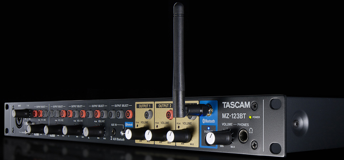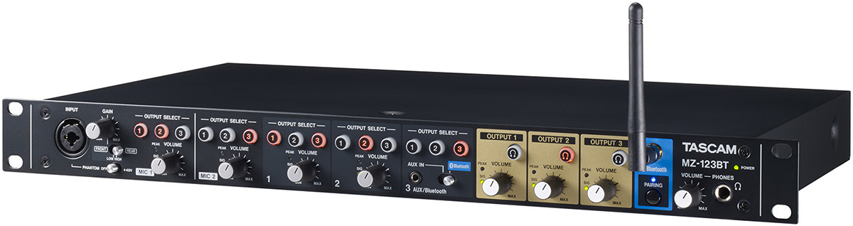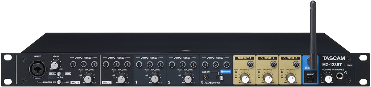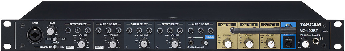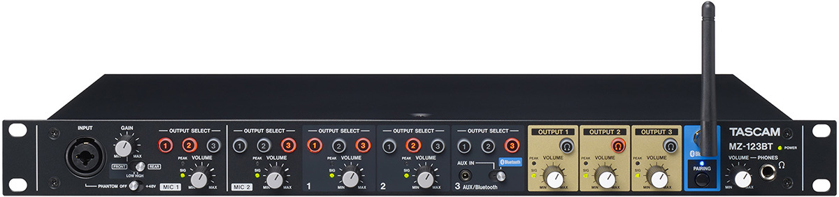 Tascam MZ-123BT рековый микшер, входы: 1-2 каналы микрофонные, 3-4 каналы стерео, 5 канал стерео/Bluetooth выход: 3 зоны стерео + на наушники
