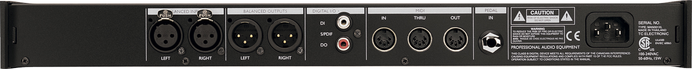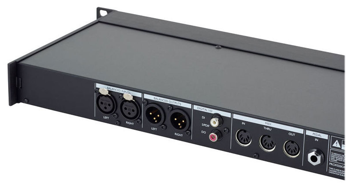 Вся коммутация выведена на заднюю панель процессора. Там расположены: аналоговый стереовход, аналоговый стереовыход, цифровой стереовход, цифровой стереовыход, вход и выход MIDI, разъём для подключения G-Switch и разъём питания. Питается процессор от 220В, блок питания встроенный.