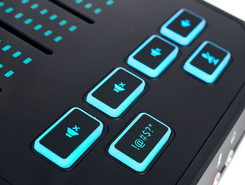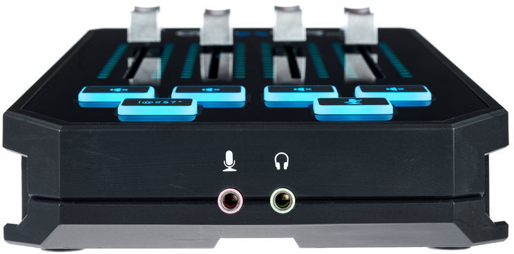 На передней панели находятся четыре фейдера, пять кнопок включения/выключения для каждого канала и микрофона, одна функциональная кнопка. Предусмотрена настраиваемая RGB-подсветка. Ее, а также маршрутизацию звука и его отключение, можно контролировать через приложение.